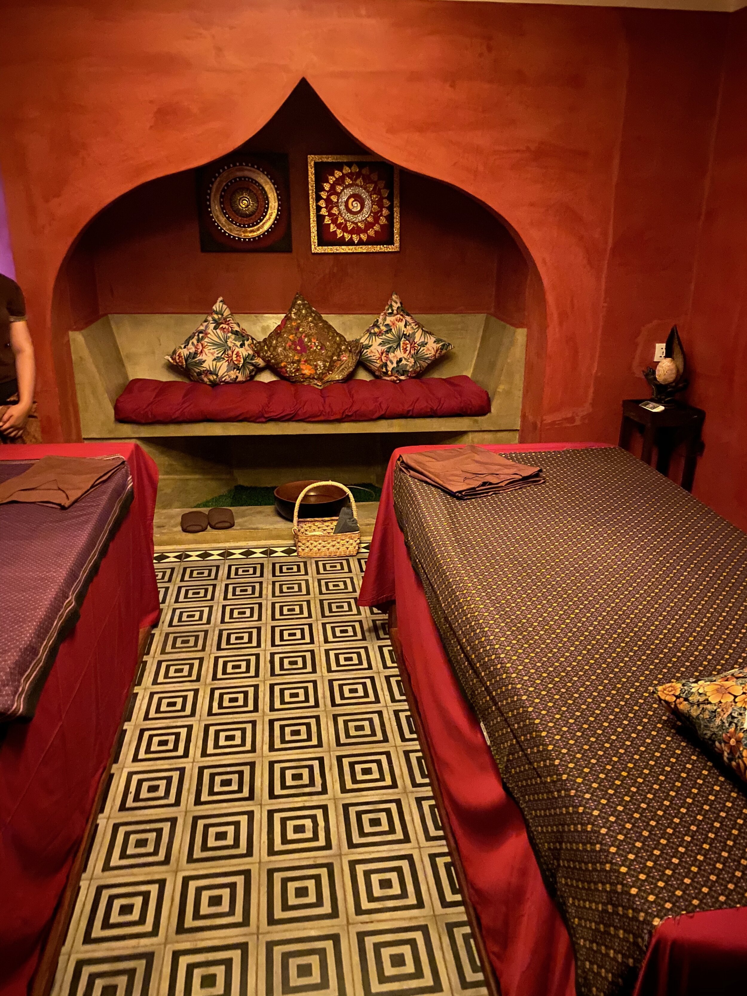 The long-term aim is for this hotel to turn into a day spa, which kills my dream of booking a one-way ticket to Cambodia and living in this hotel. But the energy was so relaxed and spa-esque that the idea didn't shock me. I sampled the spa treatments and received a complimentary 60-minute full-body Khmer massage. Never underestimate a petite masseuse—Thai massages no longer hold the title for firmness. The spa rooms were decorated with earthy, red, and gold tones. I couldn't walk through the hallway to the treatment rooms without taking pictures. I felt like I was in a Herbal Essence commercial.